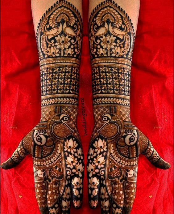 Peacock motifs in mehndi designs represent grace, beauty, and pride. Brides often opt for peacock-themed mehndi patterns to symbolize their own regal presence on their wedding day. These designs typically feature a majestic peacock with its feathers displayed in all their glory.