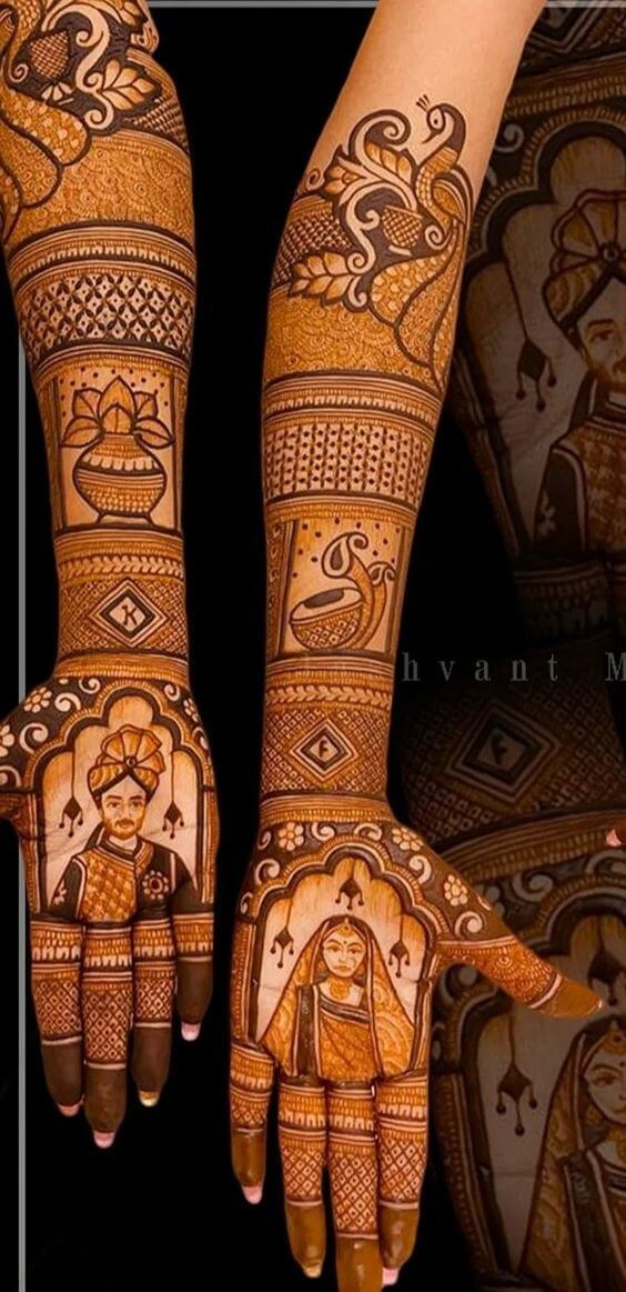 For brides who want a truly unique mehndi design, consider getting a portrait of your partner or yourself intricately woven into the design. This personalized touch adds an emotional and sentimental aspect to your mehndi, making it even more special.